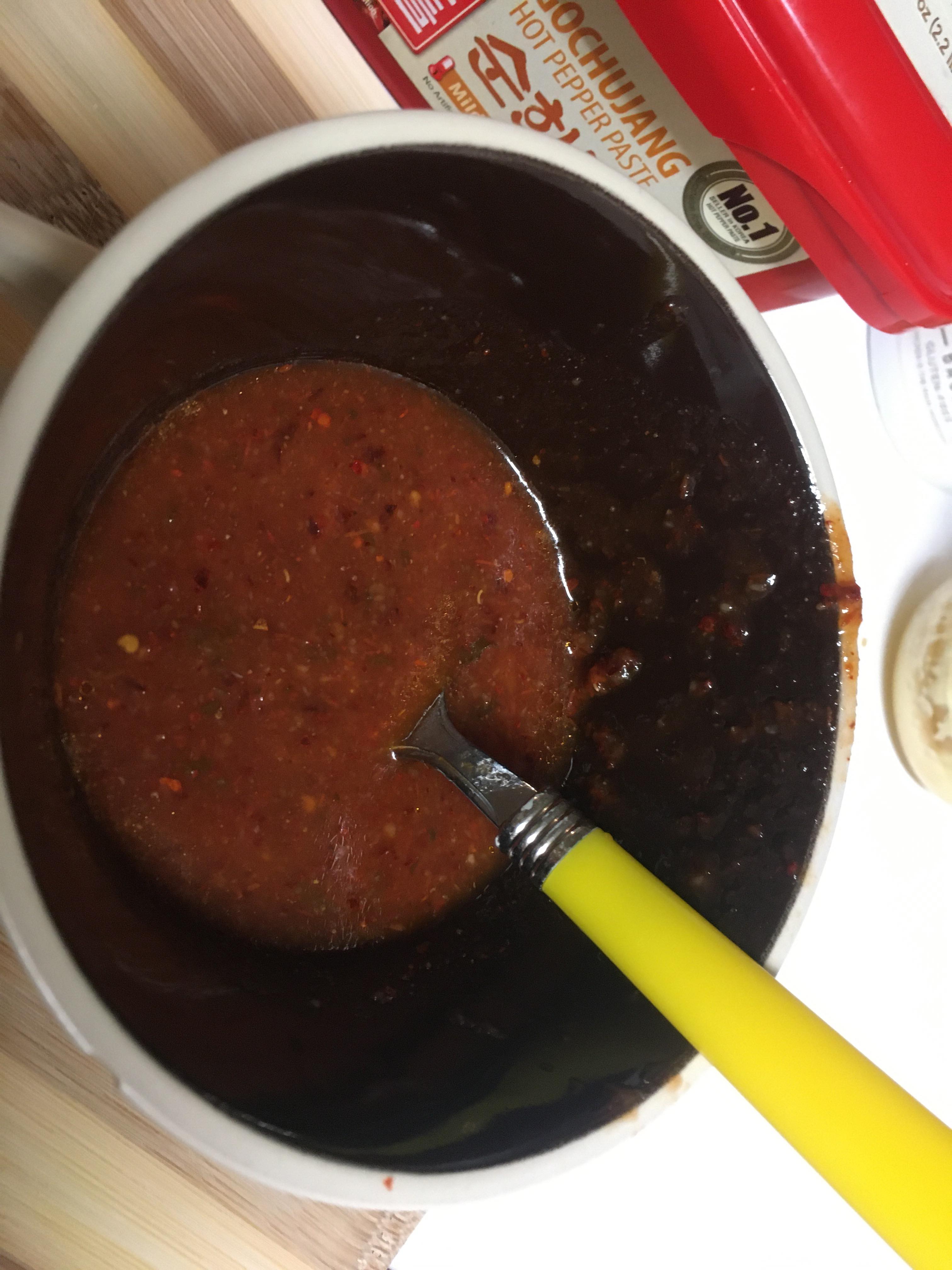 고추장, 참기름, 맛술, 진간장, 시판 스파게티 소스, 고체 치킨스톡 (다시다), 마늘이 있습니다.