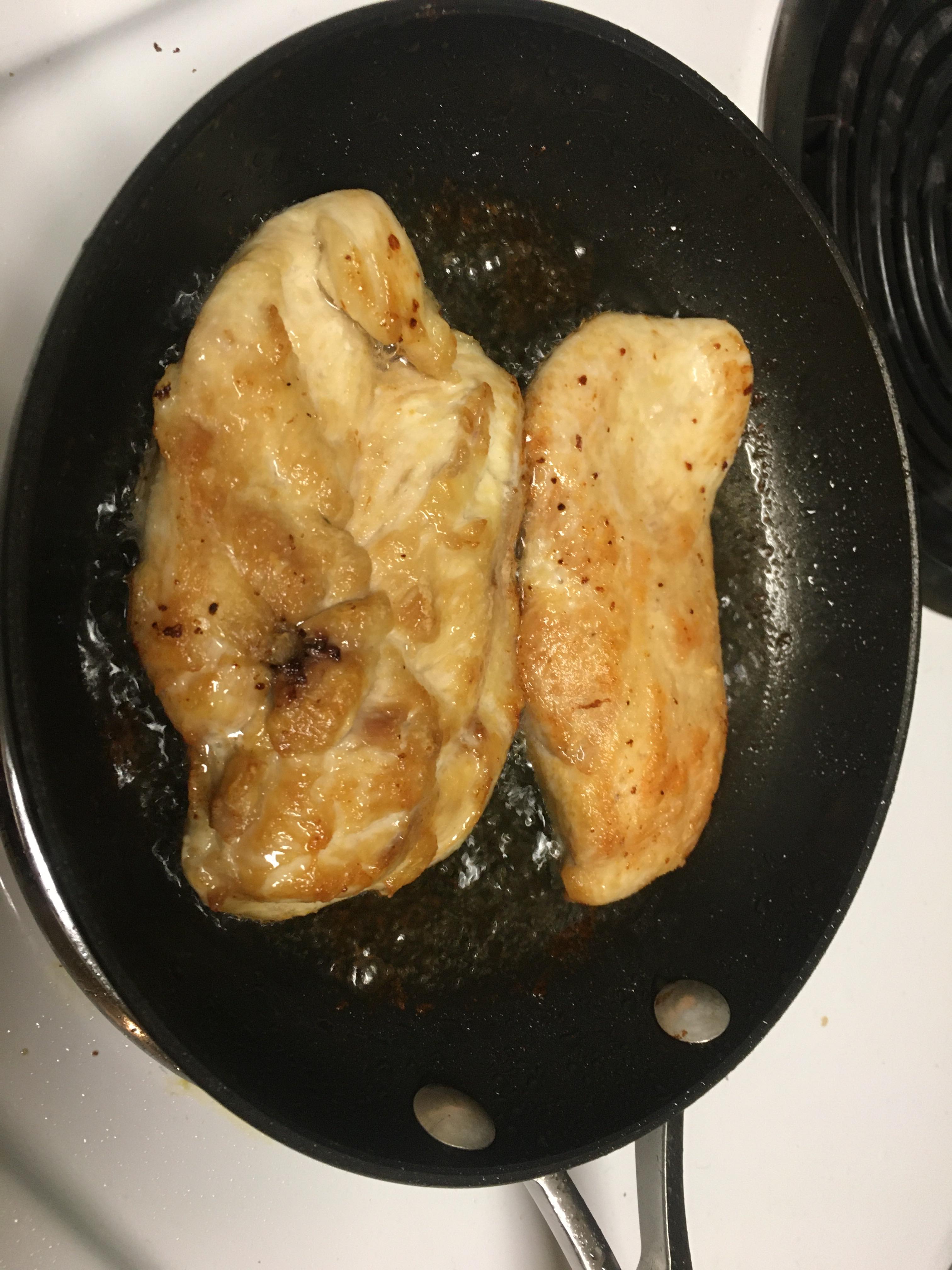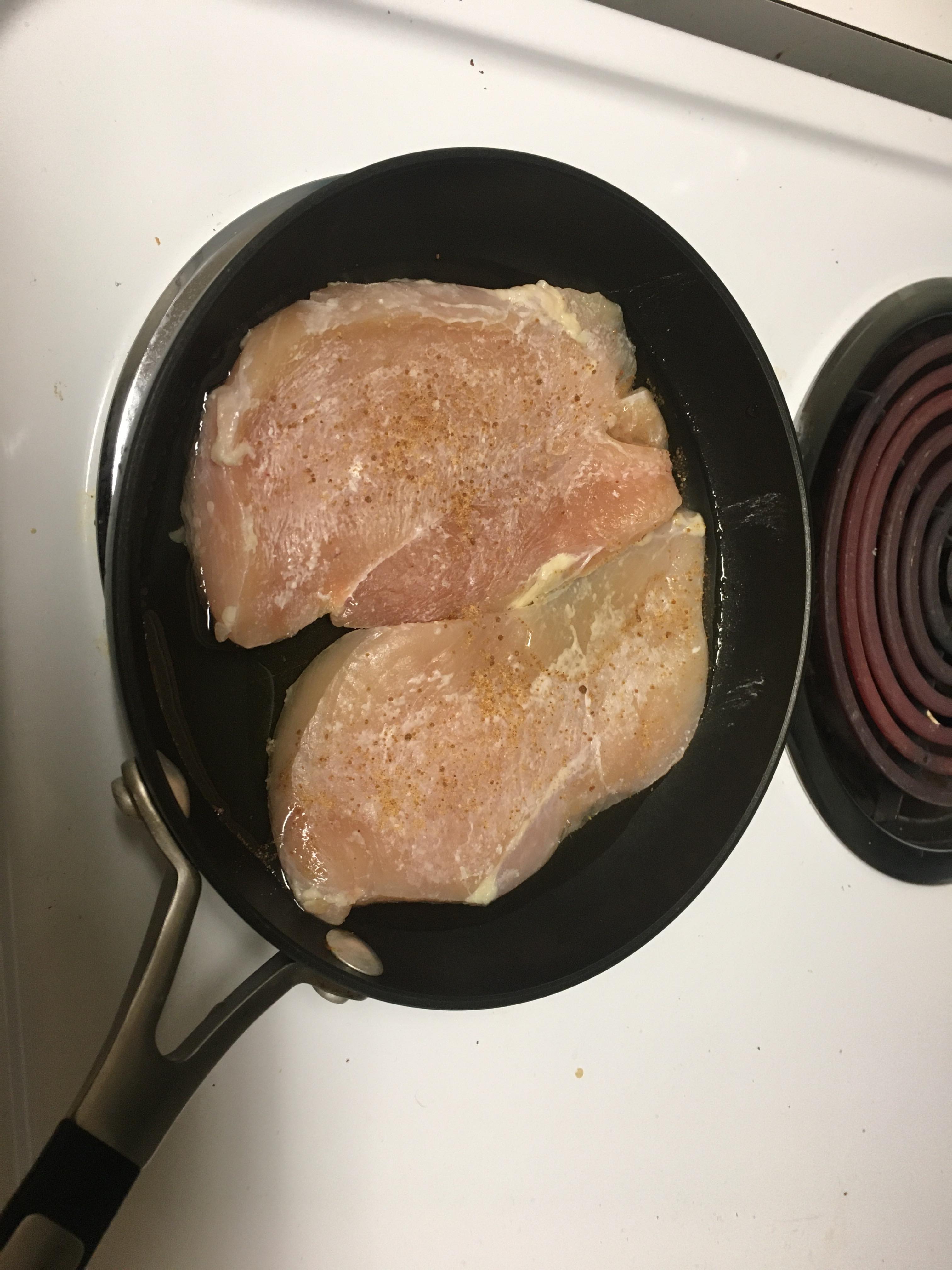 달궈진 팬에, 치킨을 바로 올려줍니다.