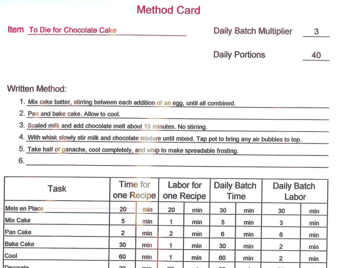 그 뒤에 레시피를 세분화 해 주세요, 크림 치즈 마늘 데쉬쉬의 레시피 같은 경우 크림치즈믹스, 갈릭소스, 데니쉬, 그리고 최종 본 이렇게 4개가 나옵니다. 이렇게 세분화된 레시피가 있으면 직원들에게 쉽게 지침을 내릴 수가 있습니다. 레스토랑 통 레시피를 cooker 에게 주게 되면 어떤 사람은 일이 빨리 끝나고 어떤 사람은 너무 오래걸리고, 또한 서로 도와주다가 일이 꼬일 수가 있어요, 그렇기에 이렇게 세분화 하고 todo list를 만들어 자신이 한일 하나씩 지워나갈 수 있게 하는 것이 좋아요. 문론, 이것은 베이커리나 고급 레스토랑 방법이에요. 일반 레스토랑에서는 통 레시피를 적은 직원이 책임지는 것이 나을 수 있어요.